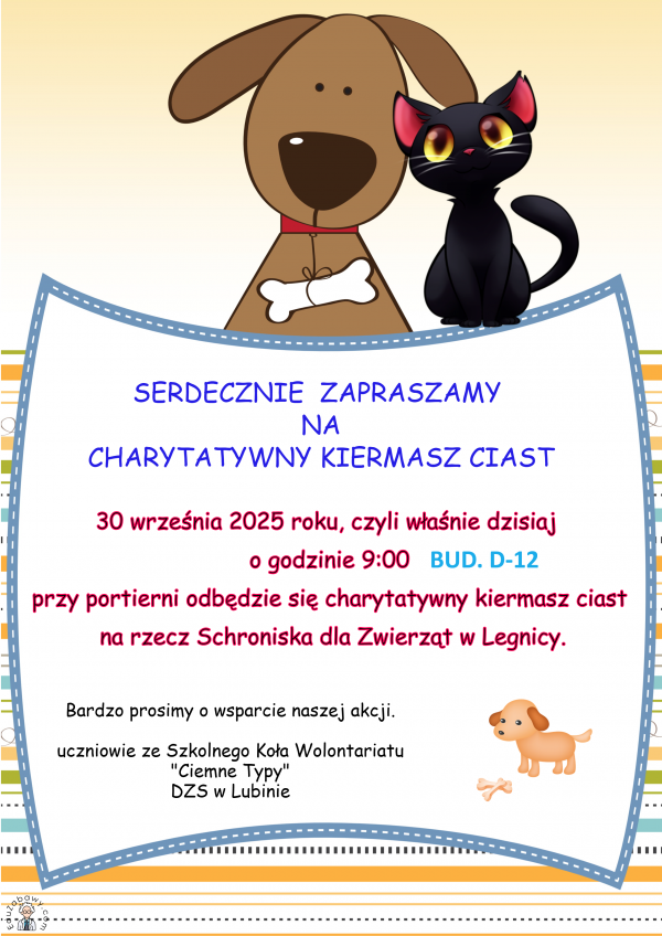 Uczniowie ze szkolnego koła wolontariatu „Ciemne Typy” z Dolnośląskiego Zespołu Szkół w Lubinie postanowili połączyć pasję do pieczenia z chęcią niesienia pomocy. Zorganizowali charytatywny kiermasz ciast, z którego dochód został przeznaczony na wsparcie Schroniska dla Zwierząt w Legnicy.